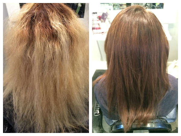 All we can say is don’t try this at home. This technique is best left to, not just a professional stylist but one who is trained in the art of color correction. Therapy hair stylists train extensively on color and color correction.